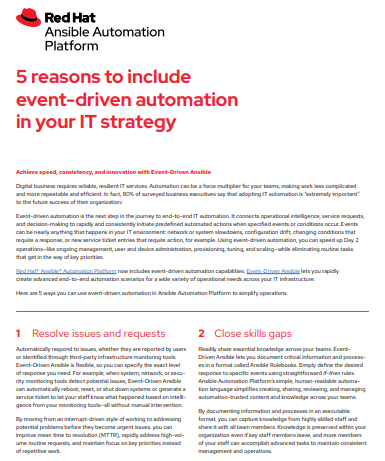 Event-driven automation is the next step in the journey to end-to-end IT automation. It connects operational intelligence, service requests, and decision-making to rapidly and consistently initiate predefined automated actions when specified events or conditions occur. Events can be nearly anything that happens in your IT environment: network or system slowdowns, configuration drift, changing conditions that require a response, or new service ticket entries that require action, for example. Using event-driven automation, you can speed up Day 2 operations—like ongoing management, user and device administration, provisioning, tuning, and scaling—while eliminating routine tasks that get in the way of key priorities.