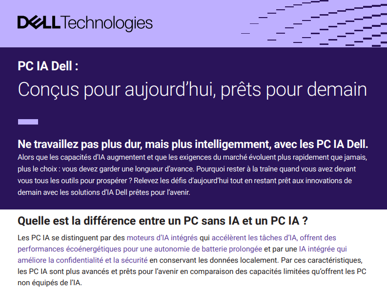 Alors que les capacités d’IA augmentent et que les exigences du marché évoluent plus rapidement que jamais, plus le choix : vous devez garder une longueur d’avance. Pourquoi rester à la traîne quand vous avez devant vous tous les outils pour prospérer ? Relevez les défis d’aujourd’hui tout en restant prêt aux innovations de demain avec les solutions d’IA Dell prêtes pour l’avenir.
