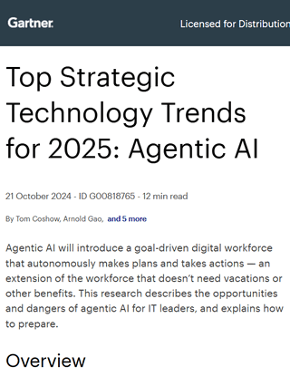 Gartner recently published the Top Strategic Technology Trends for 2025 report, reporting how, autonomous AI agents (i.e. agentic AI) "will dramatically upskill workers and teams, enabling them to manage complicated processes, projects and initiatives through natural language."